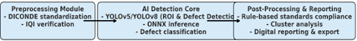 - An AI Detection Core trained on a large, annotated dataset to detect and classify defects. The IQI and defect detection models use YOLOv5, while the ROI model uses YOLOv8. The system utilizes both the YOLOv5 and YOLOv8 models for high-speed object detection and instance segmentation, enabling the identification of six key defect types: porosities, slag inclusions, lack of fusion (LOF), lack of penetration (LOP), and root/external undercuts.